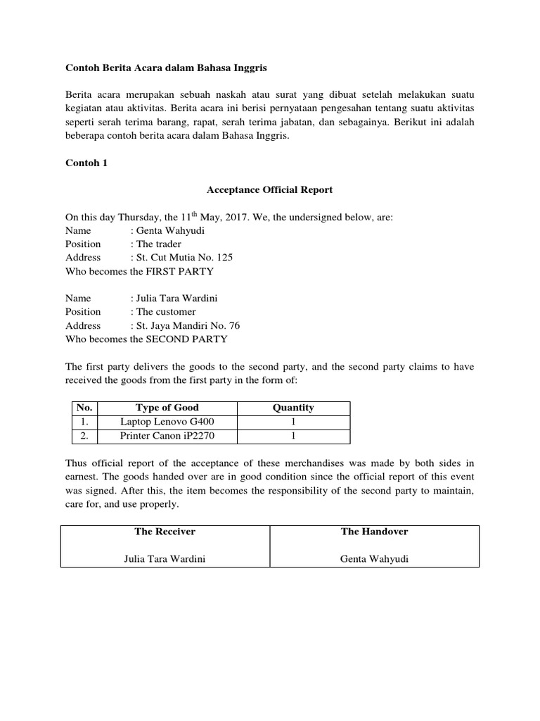 Contoh berita acara serah terima barang atau dokumen. Selain itu, berita acara juga bisa dijadikan sebuah bukti legal mengenai peristiwa tertentu, serah terima, transaksi, jual beli. Documents similar to contoh berita acara kejadian. Umumnya berita acara tersebut disusun sesudah kita mengerjakan sebuah aktifitas atau kegiatan. Beberapa hal yang perlu diperhatikan.